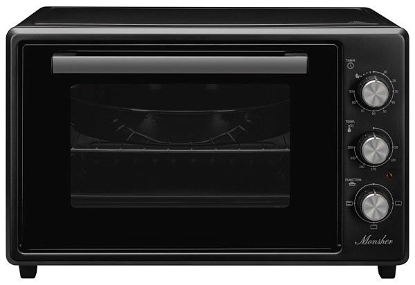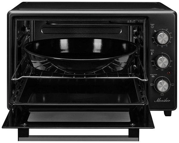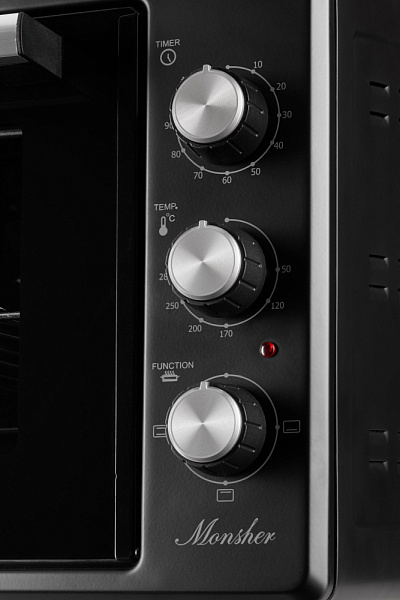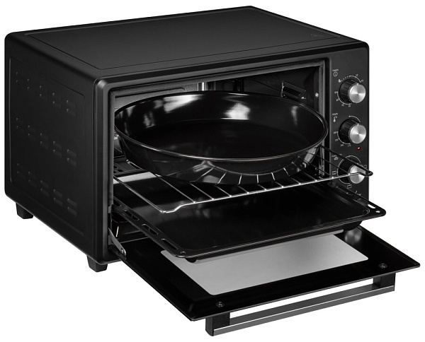 В комплект входят глубокий противень, плоский противень круглой формы, металлическая решетка. Корпус и фронтальная панель выполнены из металла, внутреннее покрытие — эмаль. Прорезиненные ножки крепко фиксируют прибор на поверхности. Встроена индикация включения и режима работы. Дверца духовки сделана из однослойного стекла. Корпус выполнен в белом цвете.