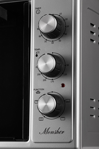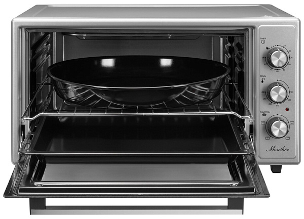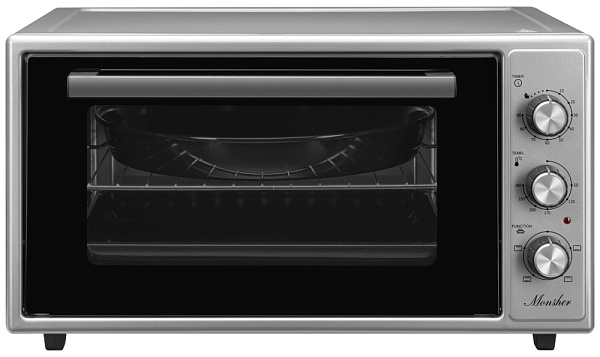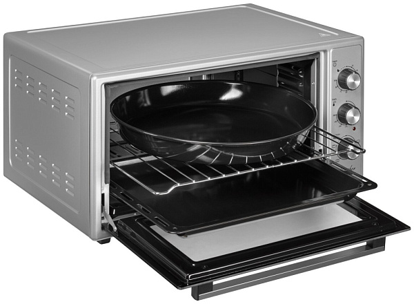 Дверца оснащена двухслойным стеклом. Прорезиненные ножки обеспечивают устойчивость на столешнице. Предельная потребляемая мощность - 1500 Вт. В наборе поставляются решетка, круглый противень. Длина сетевого кабеля для подключения к розетке - 1,5 м. Корпус изготовлен из металла. Габариты - 30х50,5х38 см. Вес - 10,1 кг.