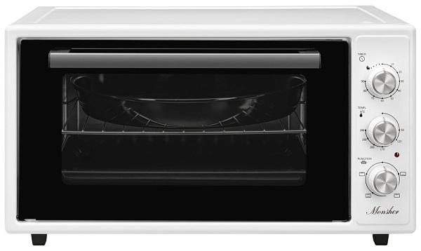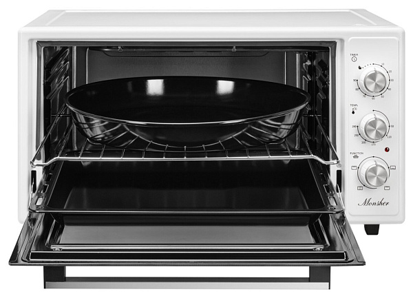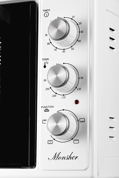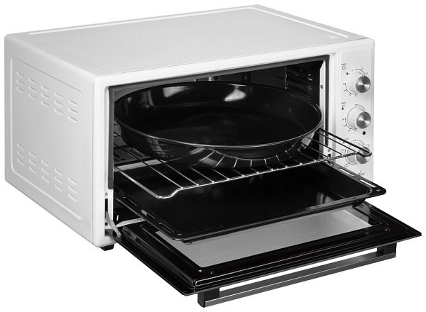 Дверца оснащена двухслойным стеклом. Прорезиненные ножки обеспечивают устойчивость на столешнице. Предельная потребляемая мощность - 1500 Вт. В наборе поставляются решетка, круглый противень. Длина сетевого кабеля для подключения к розетке - 1,5 м. Корпус изготовлен из металла. Габариты - 30х50,5х38 см. Вес - 10,1 кг.
