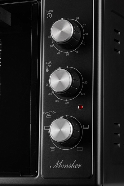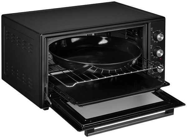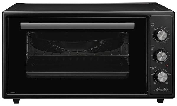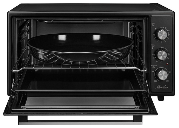 Дверца оснащена двухслойным стеклом. Прорезиненные ножки обеспечивают устойчивость на столешнице. Предельная потребляемая мощность - 1500 Вт. В наборе поставляются решетка, круглый противень. Длина сетевого кабеля для подключения к розетке - 1,5 м. Корпус изготовлен из металла. Габариты - 30х50,5х38 см. Вес - 10,1 кг.