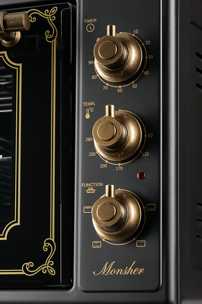 Механическое управление делает использование мини-печи Monsher максимально удобным и понятным. Благодаря таймеру вы сможете контролировать время приготовления и не беспокоиться о готовности блюда.