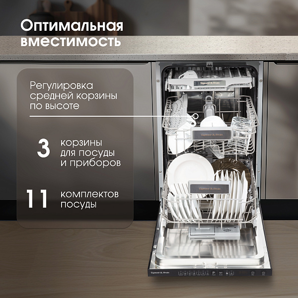 Три корзины позволят разместить посуду равномерно на всех уровнях, таким образом вода будет доставать до самых отдаленных «мертвых» углов и качество мытья будет выше.