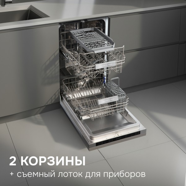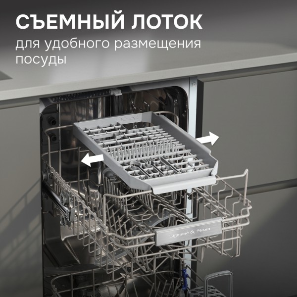 • Верхняя корзина оснащена передвигаемым лотком для приборов, который можно снять для размещения больших предметов посуды или расположить справа или слева для удобства загрузки.