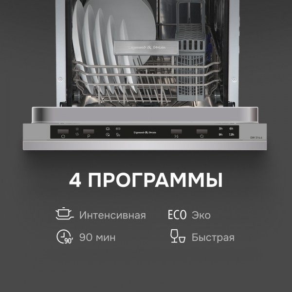 Посудомойка DW 314.4 от Zigmund & Shtain станет отличным помощников в доме, освобождая время и силы на более важные дела, чем мытье посуды. А экономичность работы техники порадует вас низкими тратами на воду и электричество. Производитель предоставляет расширенную гарантию на 2 года.
