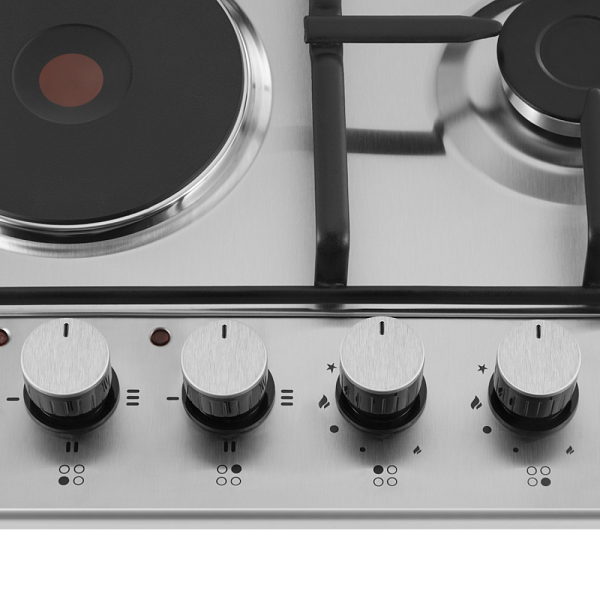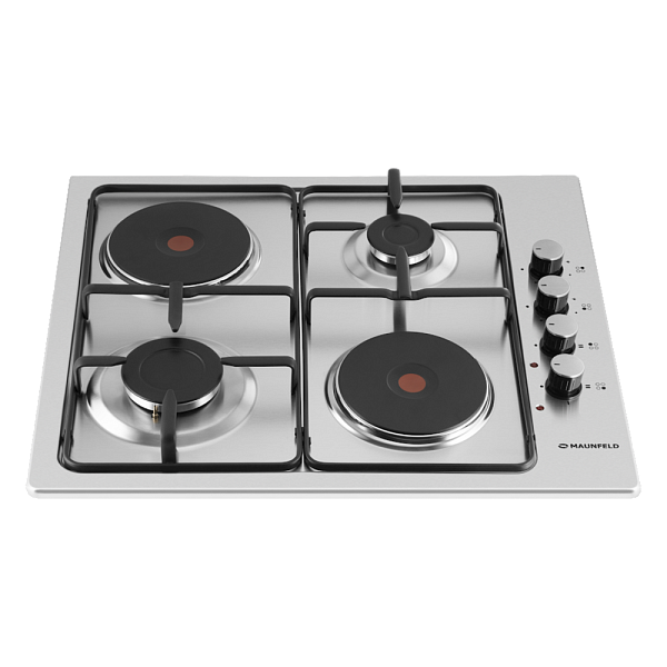Maunfeld EEHS.64.5ES/KG — это комбинированная варочная поверхность с четырьмя конфорками, две из которых газовые и две — электрические. Элементы управления — поворотные ручки, расположенные с правой стороны. Материал поверхности — нержавеющая сталь, решётки эмалированные. Модель может работать на разных типах газа. Функция газ-контроля обеспечивает безопасную эксплуатацию.