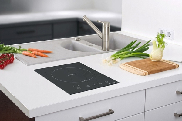 Индукционная поверхность работает за счет образовавшегося магнитного поля между катушкой, которая находится под стеклом, и посудой. При этом сама стеклокерамика нагревается за счет горячей посуды стоящей на ней. Она проста в уходе и безопасная для детей.