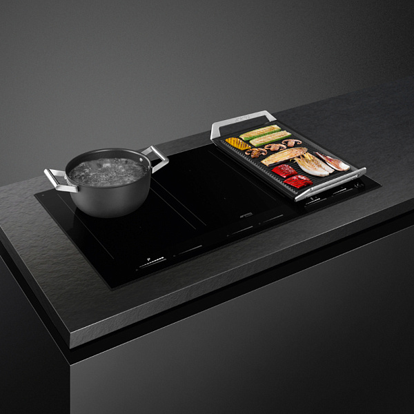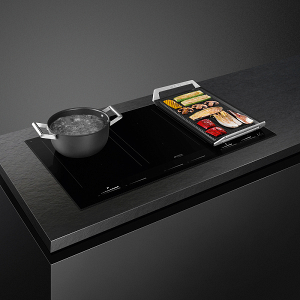 Индукционная поверхность работает за счет образовавшегося магнитного поля между катушкой, которая находится под стеклом, и посудой. При этом сама стеклокерамика нагревается за счет горячей посуды стоящей на ней. Она проста в уходе и безопасная для детей.