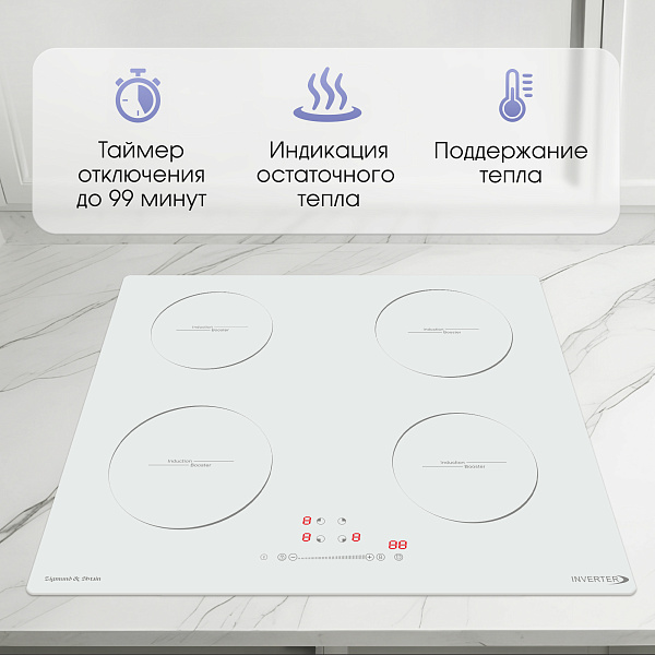 Индукционная поверхность работает за счет образовавшегося магнитного поля между катушкой, которая находится под стеклом, и посудой. При этом сама стеклокерамика нагревается за счет горячей посуды стоящей на ней. Она проста в уходе и безопасная для детей.