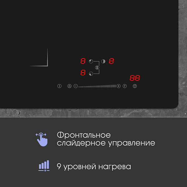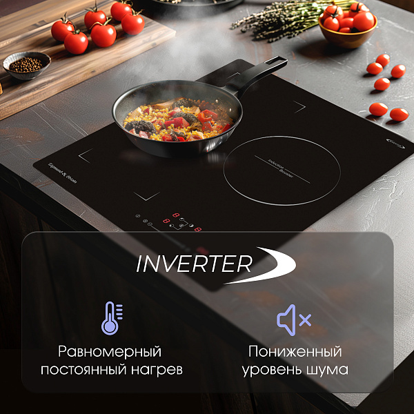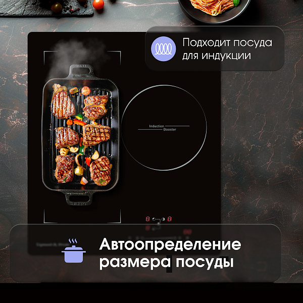 Индукционная поверхность работает за счет образовавшегося магнитного поля между катушкой, которая находится под стеклом, и посудой. При этом сама стеклокерамика нагревается за счет горячей посуды стоящей на ней. Она проста в уходе и безопасная для детей.