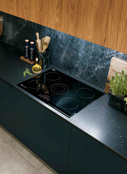 Индукционная поверхность работает за счет образовавшегося магнитного поля между катушкой, которая находится под стеклом, и посудой. При этом сама стеклокерамика нагревается за счет горячей посуды стоящей на ней. Она проста в уходе и безопасная для детей.