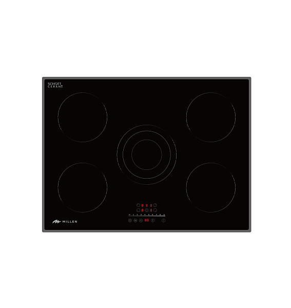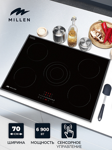 Самая мощная модель в линейке электрических варочных поверхностей бренда MILLEN имеет 5 зон нагрева, нестандартные размеры для встраивания и предназначена для просторной кухни.
