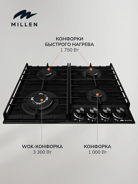 Пользователю доступно четыре конфорки, отличающиеся диаметром и мощностью. Это позволяет быстро выставить оптимальную температуру для одновременного приготовления сразу нескольких блюд. Наличие WOK-конфорки с повышенной мощностью открывает возможность в домашних условиях готовить изысканные блюда азиатской кухни. Для этого используются большие кастрюли или специализированная посуда.