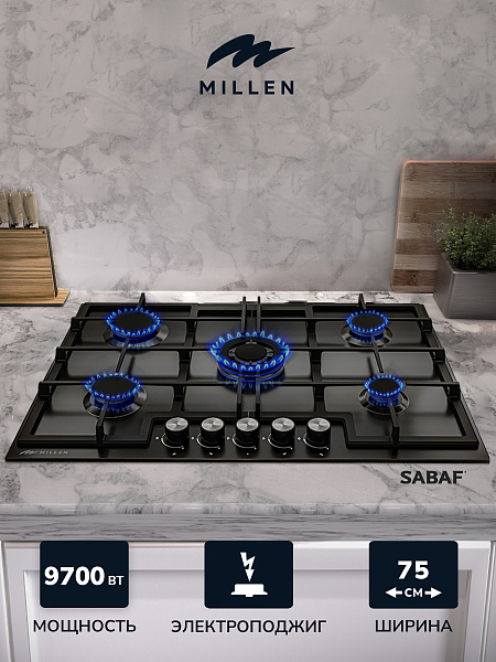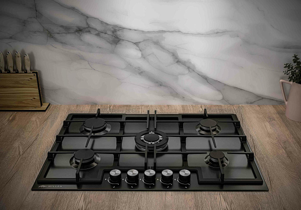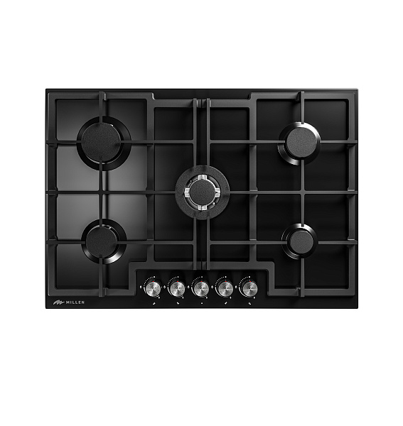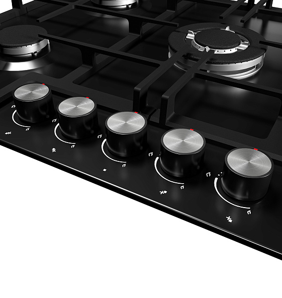 Изделие оснащено всеми необходимыми защитами для повышения безопасности пользователя. В ситуациях, когда пламя гаснет по непредвиденным обстоятельствам, подача газа на конфорку автоматически прекращается. Включение и регулировка подачи газа осуществляется посредством термостойких ручек, расположенных в нижней части панели по центру. Встроенная опция автоматического розжига позволяет быстро включать газовые горелки всего одним поворотом переключателя.