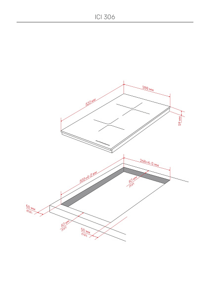 Размеры панели: ширина — 28,8 см, высота — 5,9 см, глубина — 52 см. Мощность подключения составляет 3,5 кВт. Панель имеет две конфорки с разным диаметром и мощностью: передняя — 160 мм (1,3–1,5 кВт), задняя — 180 мм (1,8–2,0 кВт). В комплекте есть вилка, длина сетевого шнура — 155 см.