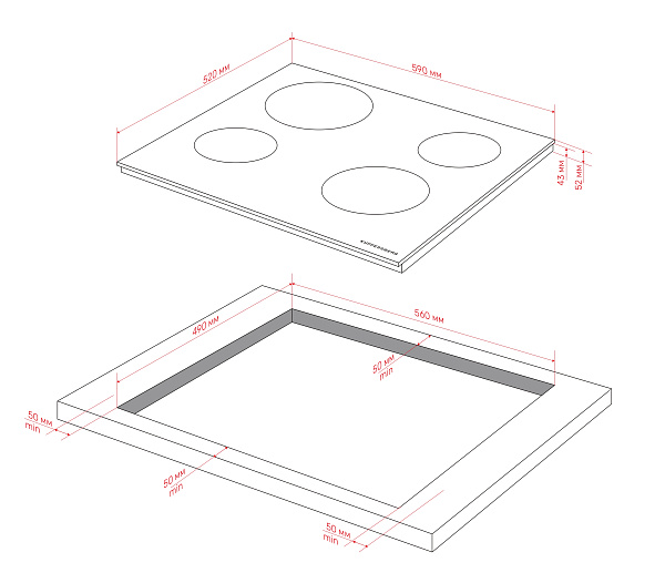 Панель имеет четыре конфорки с разным диаметром и мощностью: две по 1,8 кВт и две по 1,2 кВт. Размеры панели: ширина — 59 см, высота — 5,2 см, глубина — 52 см. Размер ниши для встраивания — 560 x 490 мм. Варочная панель оснащена полезными функциями: таймером (до 99 минут), блокировкой панели управления и автоматическим отключением.
