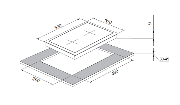 Размеры панели: ширина — 30 см, высота — 5,2 см, глубина — 51 см. Размеры ниши для встраивания — 280х480 мм. Мощность конфорок: передняя — 1 кВт, задняя — 2,7 кВт. В комплекте есть форсунки под сжиженный газ, длина сетевого шнура — 100 см.