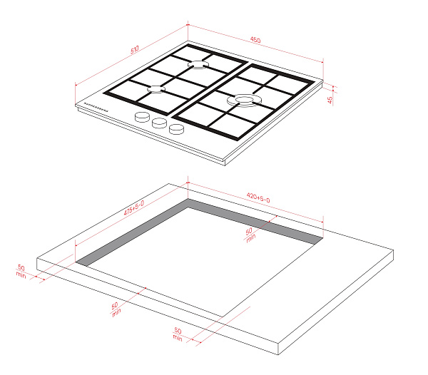 Технические характеристики панели включают ширину 45 см, высоту 5,2 см и глубину 51 см. Модель относится к коллекции High-Tech и произведена в Китае. Варочная панель оснащена автоматическим электроподжигом и системой газ-контроля конфорок, что повышает безопасность использования. Толщина закалённого стекла составляет 8 мм, а тип конфорок — Chinese SABAF. Длина сетевого шнура — 95 см.