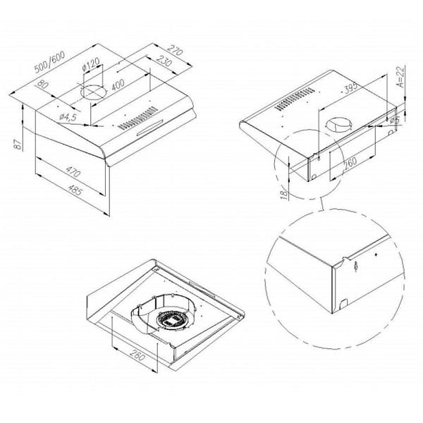 Стандартный отвод у вытяжек 100мм, также в комплектации есть переходник на 150 мм.