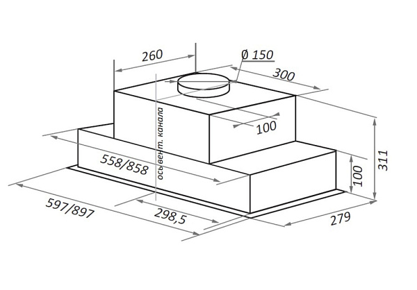 Стандартный отвод у вытяжек 100мм, также в комплектации есть переходник на 150 мм.