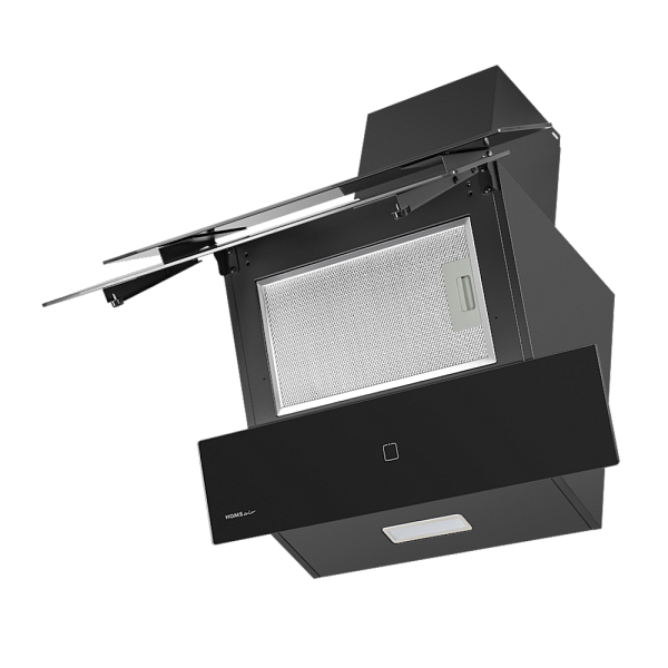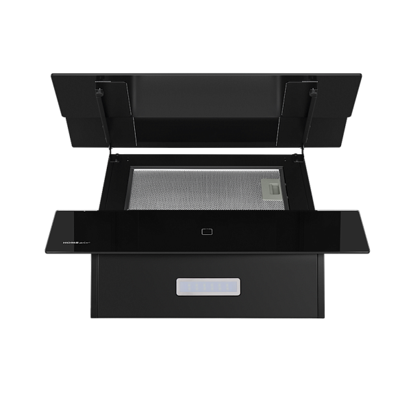 Алюминиевый фильтр находится за каскадом тонированных стекол, что придает вытяжке эстетический вид.