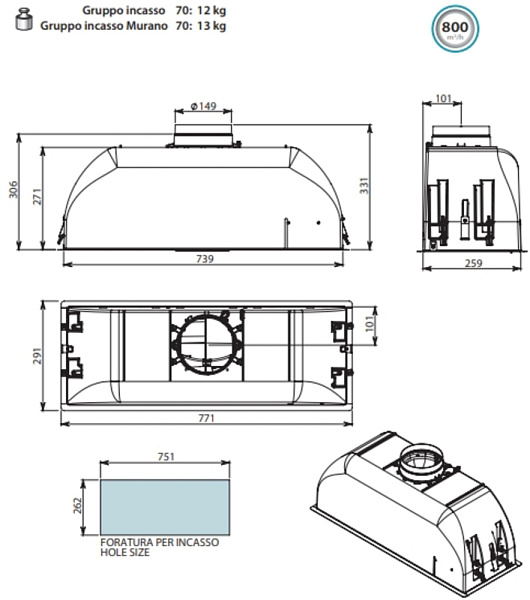 FALMEC DESIGN GRUPPO INCASSO MURANO 70 INOX VETRO BIANCO вытяжка нержавеющая сталь