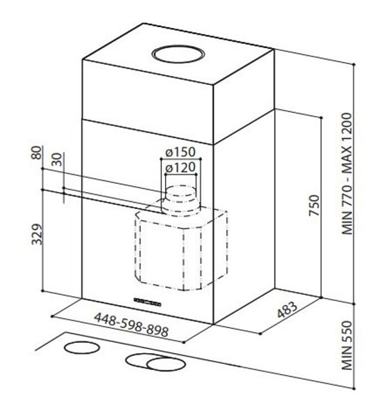 Стандартный отвод у вытяжек 100мм, также в комплектации есть переходник на 150 мм.