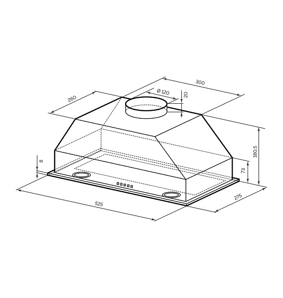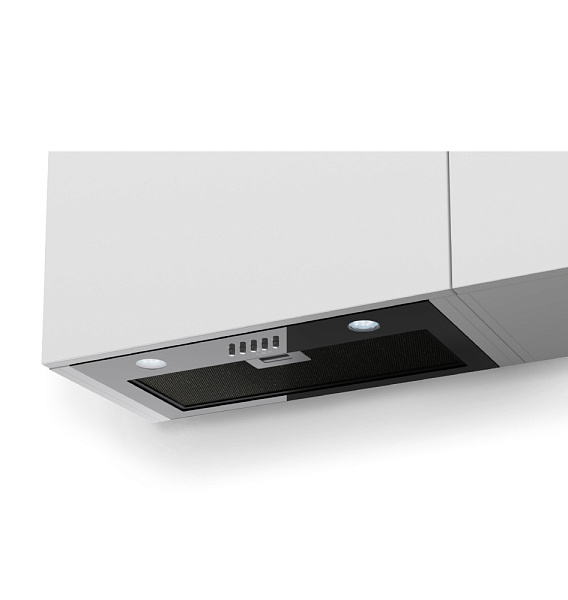 Стандартные размеры рассчитаны на варочную панель шириной 60 см и позволяют встроить вытяжку в верхний кухонный шкаф глубиной 30 см. Алюминиевый жироулавливающий фильтр поставляется в комплекте с устройством. Для лучшей очистки воздуха от неприятных запахов рекомендуется дополнительно приобрести сменный угольный фильтр.