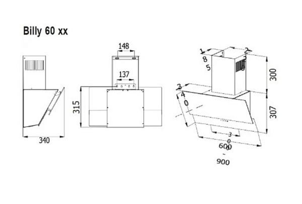 Ширина вытяжки 60 см, это позволит использовать ее над варочными панелями от 45 до 60 см.