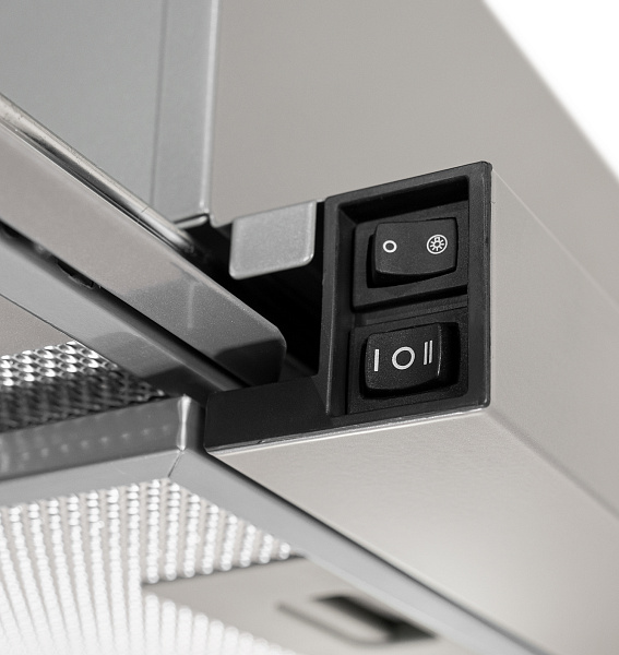 Управление максимально простое и понятное. Детального разбора инструкции не потребуется. Переключение режимов скоростей и подсветки реализовано с помощью двух механических переключателей, расположенных в непосредственной близости друг от друга для удобства. Всего есть два режима всасывания: низкий, подходящий для ежедневной эксплуатации и высокий, который включается, когда на кухне образуется много пара.