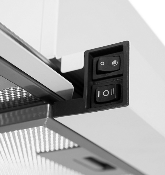Простое и интуитивно понятное управление позволяет быстро включать и выключать необходимые функции. Всего в устройстве есть два механических переключателя. Один из них отвечает за управление подсветкой, позволяющей осветить всю рабочую зону, а другой за режим работы. Всего есть две скорости: низкая, подходящая для повседневного использования и высокая, которая будет полезно во время сильного парообразования.