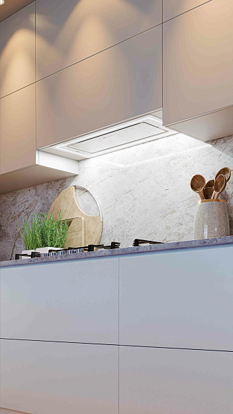 За подсветку рабочей зоны отвечает LED-лампа мощностью 12 Вт. Этого вполне достаточно для комфортного освещения плиты, без включения дополнительных источников света. При необходимости устройство может работать в режиме рециркуляции воздуха с использованием угольных фильтров. Это может потребоваться, когда в помещении отсутствует возможность обустройства нормальной вентиляции.