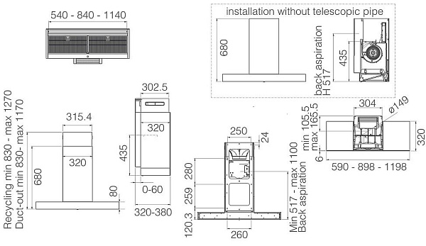 Стандартный отвод у вытяжек 100мм, также в комплектации есть переходник на 150 мм.