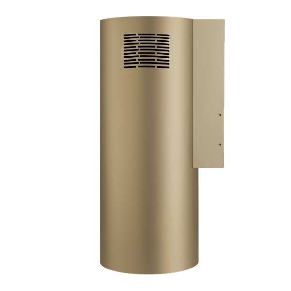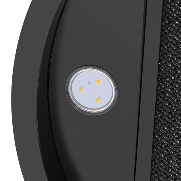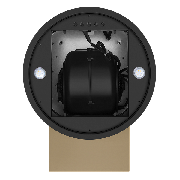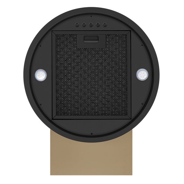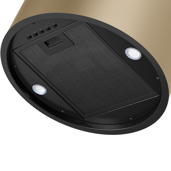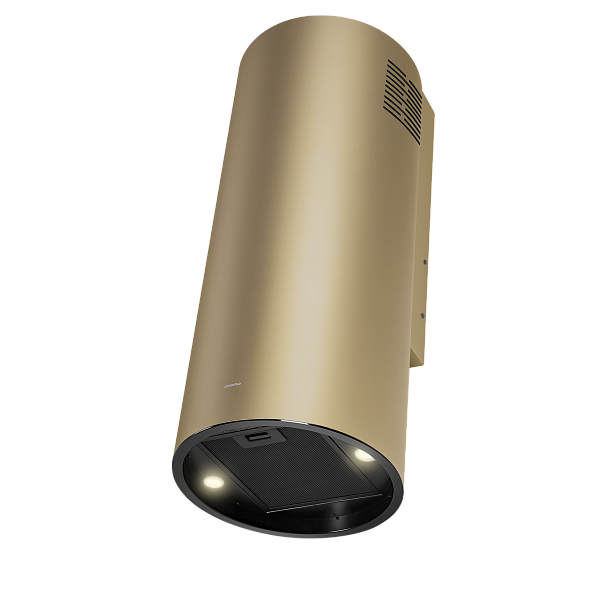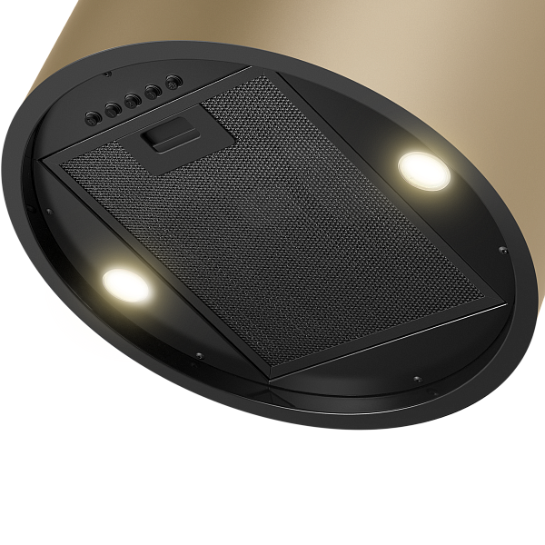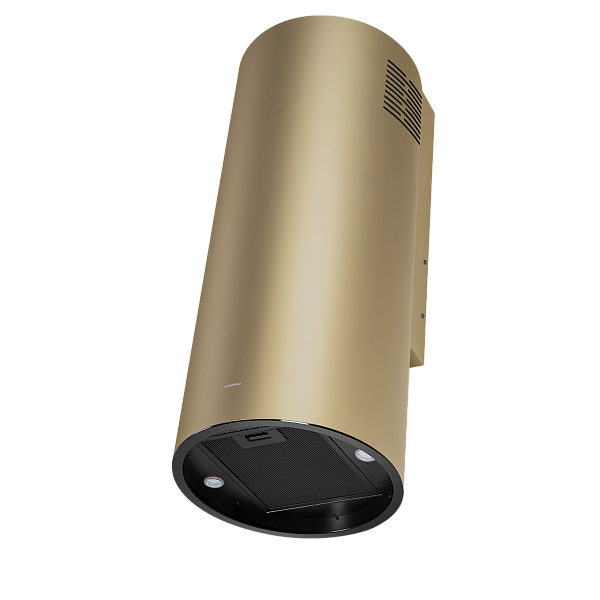 Корпус цилиндрической формы, выполненный из нержавеющей стали с термостойким покрытием черного цвета, устанавливается на стену над поверхностью плиты. Алюминиевый многослойный жироулавливающий фильтр находится в нижнем торце вытяжки.