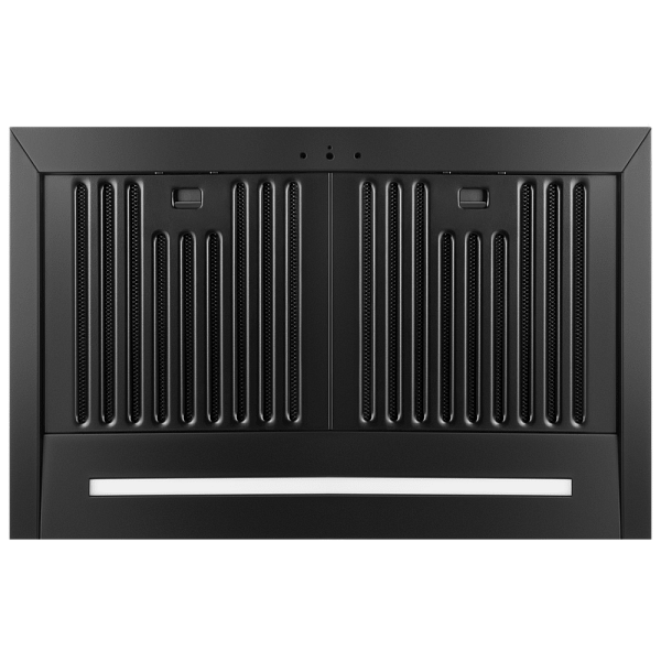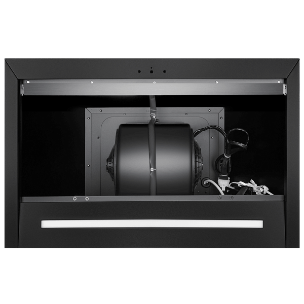 Вытяжка выполнена в цвете «чёрный антрацит» и предназначена для полного встраивания в кухонный шкаф. Металлический корпус имеет стандартные габариты, что позволяет легко интегрировать её в подвесную мебель над варочной панелью. Благодаря встраиваемому формату техника остаётся незаметной, когда не используется, сохраняя чистоту линий кухонного гарнитура.