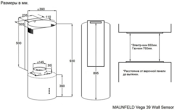 Габариты и подключение: Размеры (ШхВхГ): 390 x 930 x 505 мм. Модель подключается к воздуховоду диаметром 150 мм.