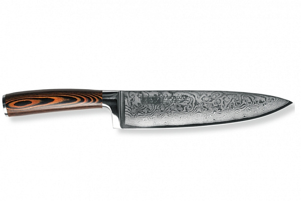 Нож "Шеф" Ножи коллекции DAMASCUS SUMINAGASHI — этовысококачественные ножи MIKADZO, сделанные подамасской технологии. «Вязкость» этой стали доста-точна для того, чтобы сохранять режущую кромкудаже при закалке до твердости 60-61 HRC (единицапо шкале Роквелла). Уникальная твердость дамасской стали, полная коррозионная устойчивость и безупречная острота лезвий — те преимущества, которые особенно ценятся в ножах коллекций DAMASCUS SUMINAGASHI. Лезвие спроектировано и изготовлено с учетом особенностей японской и европейской культуры резки, что позволяет добиться особого удобства при использовании ножа. Наряду с высокими техническими показателями эффективности, все ножи MIKADZO имеют уникальный дизайн лезвий и рукояток. Для отделки рукояток ножей DAMASCUS SUMINAGASHI применяется пакка — ламинат, состоящий из ценной древесины, пропитанной смолой,которая стабилизирует основу материала ручки.