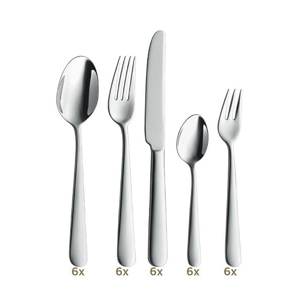 столовый нож - 6 шт, столовая вилка - 6 шт, столовая ложка - 6 шт, чайная ложка - 6 шт, вилка десертная - 6 шт