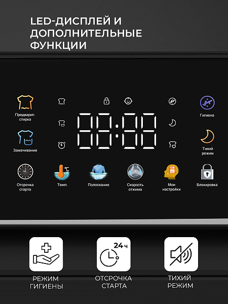 Дополнительные функции позволят вам самостоятельно выбрать оптимальные параметры стирки (дополнительное полоскание, регулировка температуры и оборотов отжима, предварительная стирка или замачивание, отсрочка старта).