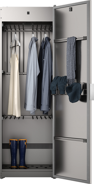 Модель оснащена вместительной камерой с регулируемыми полками и крючками, что позволяет сушить до 4 кг белья одновременно. Воздух равномерно распределяется по всей внутренней поверхности, обеспечивая деликатную сушку без перегрева и деформации тканей.