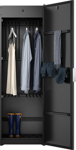 Модель оснащена вместительной камерой с регулируемыми полками и крючками, что позволяет сушить до 4 кг белья одновременно. Воздух равномерно распределяется по всей внутренней поверхности, обеспечивая деликатную сушку без перегрева и деформации тканей.