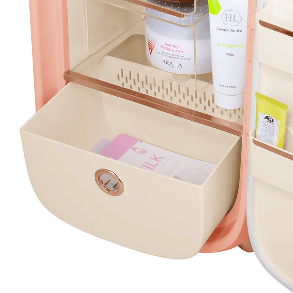 Объём идеально подходит для размещения кремов, сывороток, масок и других бьюти-продуктов. Внутри есть регулируемые полки, которые позволяют удобно организовать пространство и хранить средства разного размера.