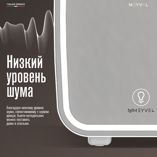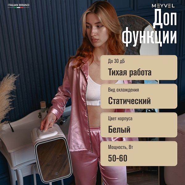 Бьюти-холодильник Meyvel MB-04HC2W – идеальный выбор для хранения косметики при оптимальной температуре от +6 до +8°C. Благодаря тихой работе (уровень шума 30 дБ) он станет стильным и полезным дополнением любой комнаты.