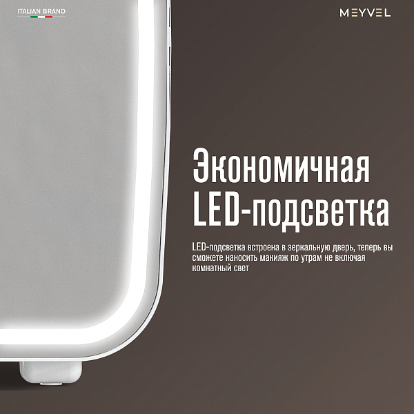 Модель MB-04HC2W оснащена встроенным в дверь зеркалом с подсветкой, что добавляет удобства – вы сможете использовать любимую косметику в любое время суток.