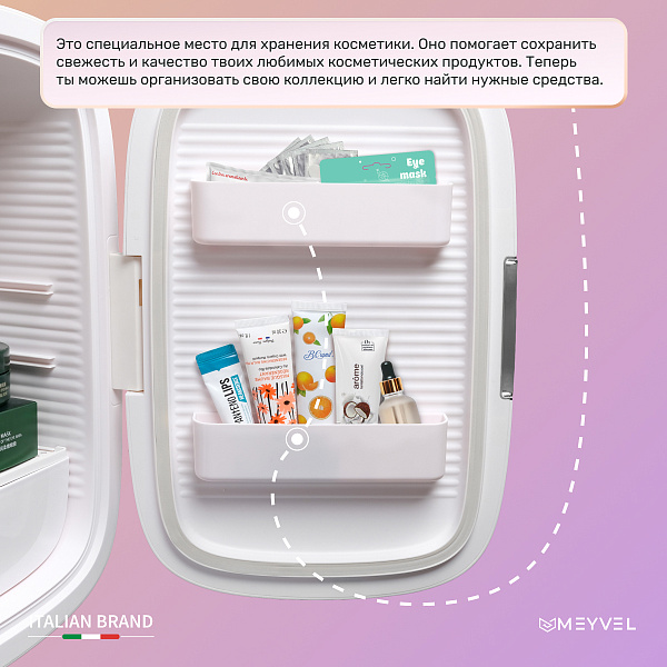 Бьюти-холодильник Meyvel MB-12C2W можно использовать в самых различных местах: от ванной комнаты до спальни, а также брать с собой в поездки и путешествия. Это отличный выбор для хранения косметики, которой требуется особый температурный режим, например, гелей для лица, сывороток, масок, а также парфюмов и уходовых средств с натуральными ингредиентами.