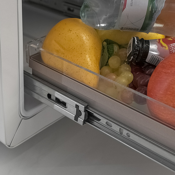 - Удобные выкатные полки полного выдвижения из пластика;