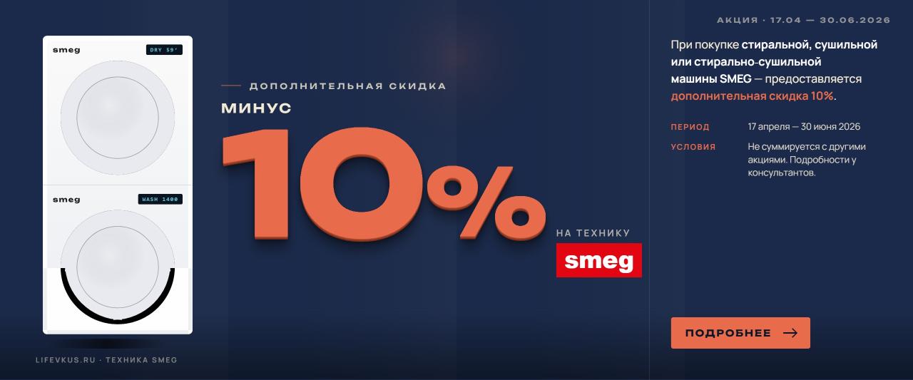 При покупке стиральной, сушильной или стирально-сушильной машины SMEG → предоставляется дополнительная скидка 10%